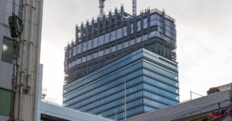 その後工事は進み、躯体は上棟。外装のガラスカーテンウォールも最上部まで到達しました!