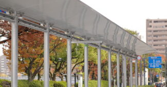 先程の稲荷町電停と全面ガラス張りの背板は共通ですが、上屋の形状が異なります。