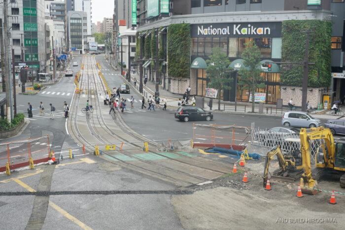 敷地から南東の猿猴橋町電停、荒神橋方面の併用軌道はほぼそのままの姿がほぼ残っています。