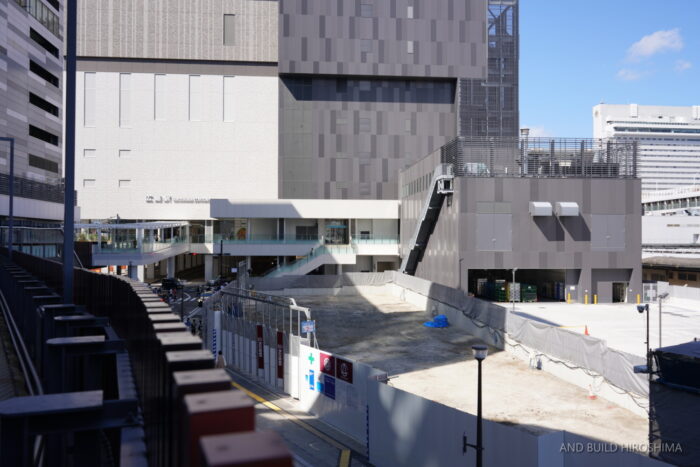 広島駅の新駅ビル「ミナモア」とはペデストリアンデッキで接続します。