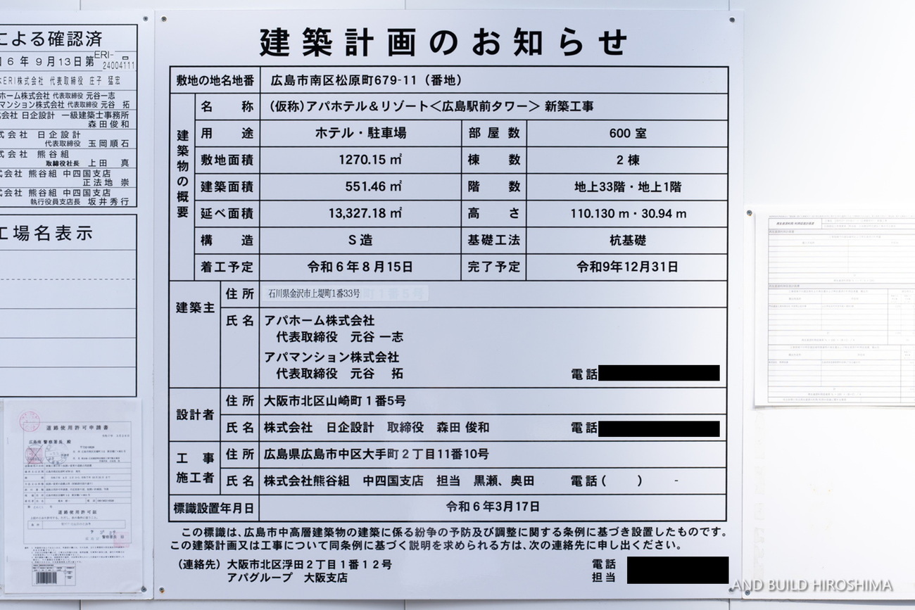 (アパグループ『広島駅エリア5棟目 アパホテル&リゾート〈広島駅前タワー〉 本日起工式開催』(https://www.apa.co.jp/slide_new/176521)より)