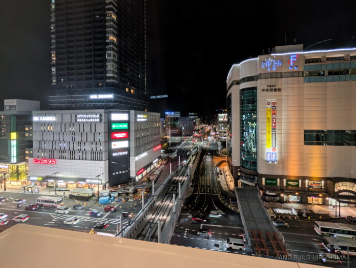 新しい広島駅ビル「ミナモア」2階、東西通路から。