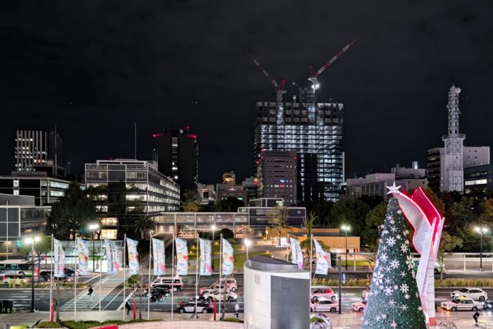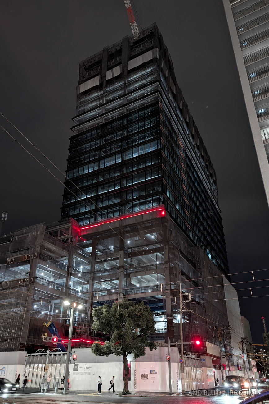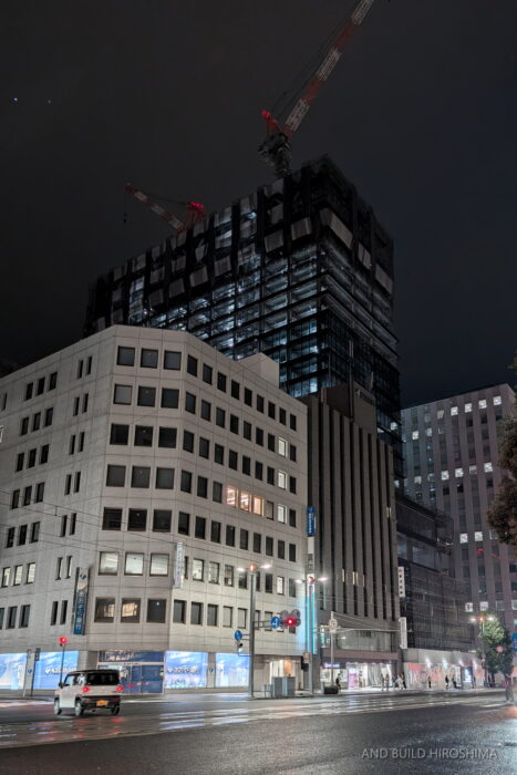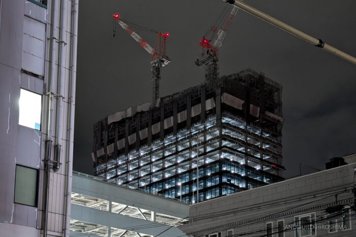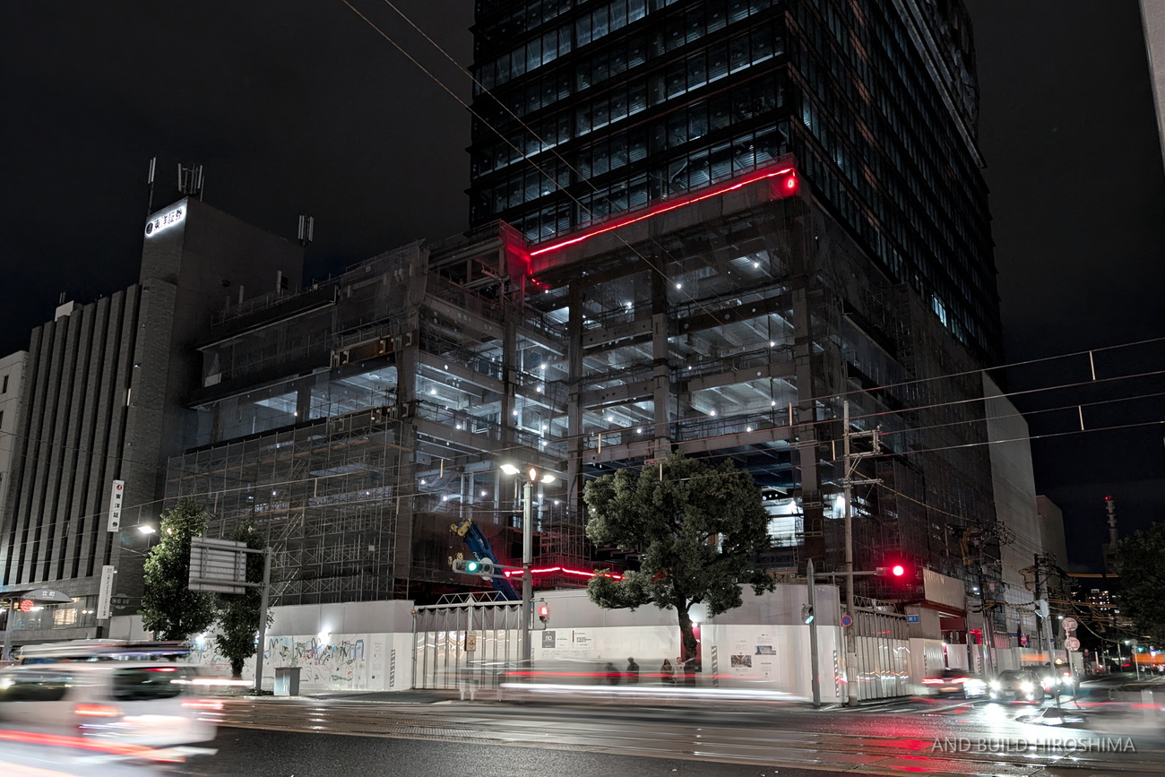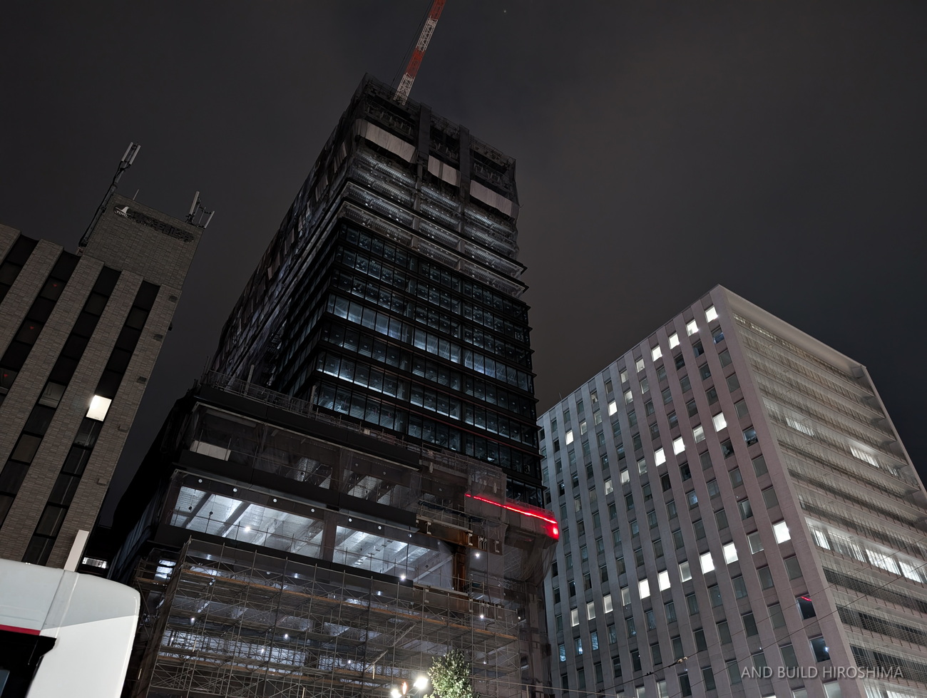 高さ約80mのスタートラム広島とともに、背の高いビルが夜空に伸びます。