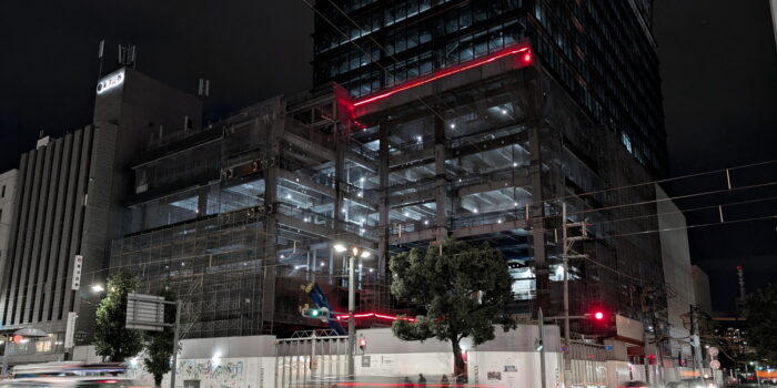 剥き出しの鉄骨が作業用の照明に照らされて、物々しい雰囲気です。