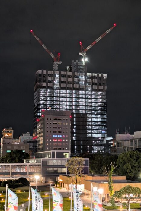 夜間に付近を歩くことがあったので、作業用の照明が瞬く独特な巨大構造物の姿をご紹介します。