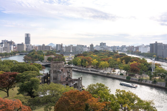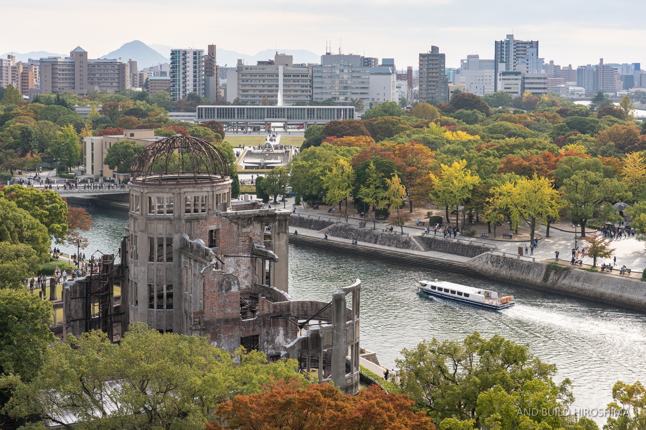 原爆ドーム、その背後に丹下健三が手がけた平和記念公園を眼下に収めます。