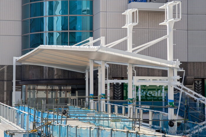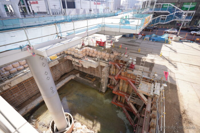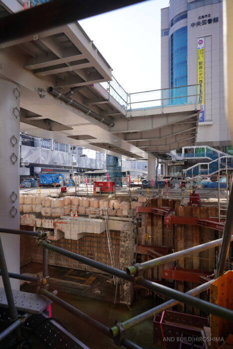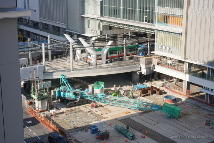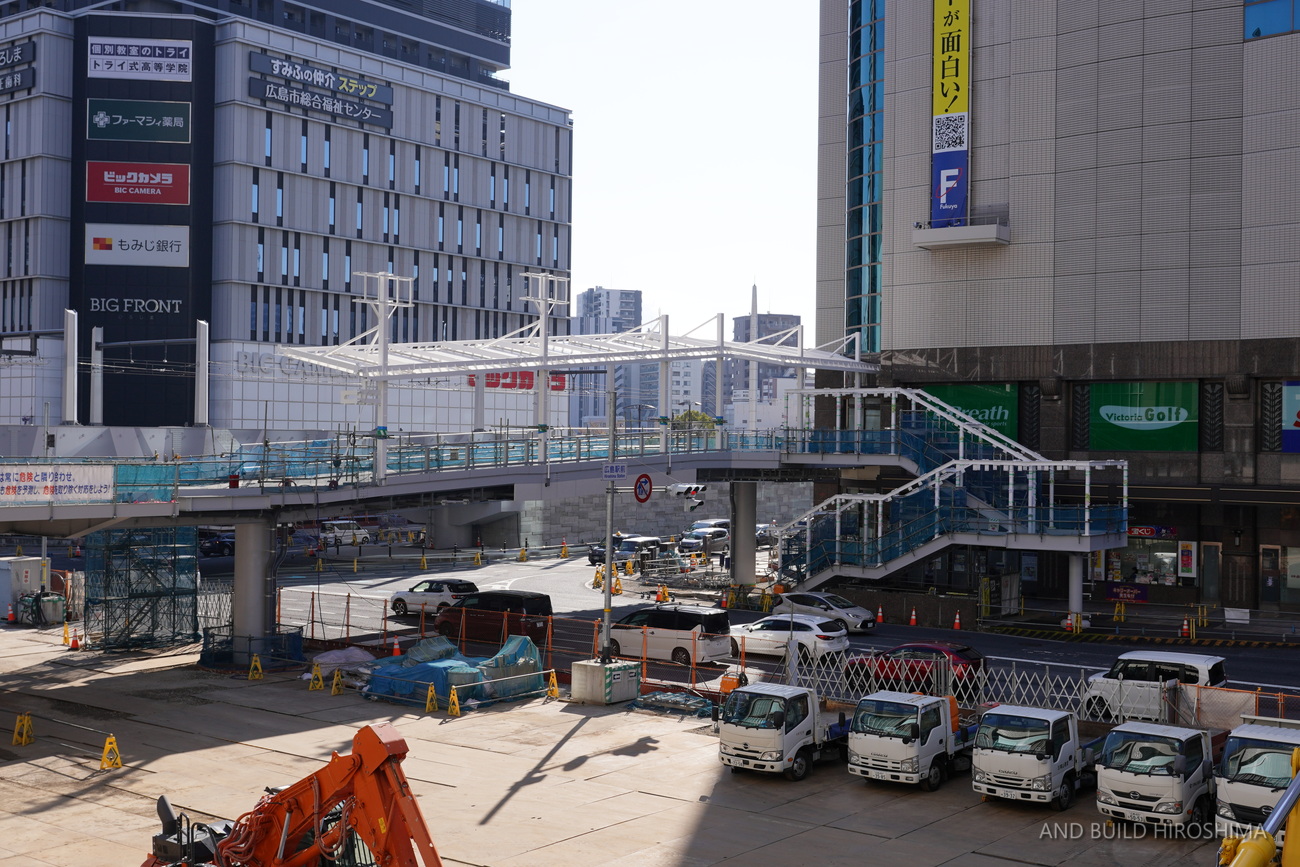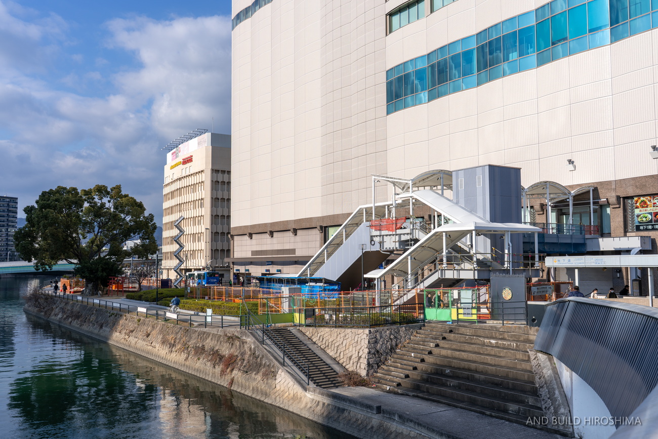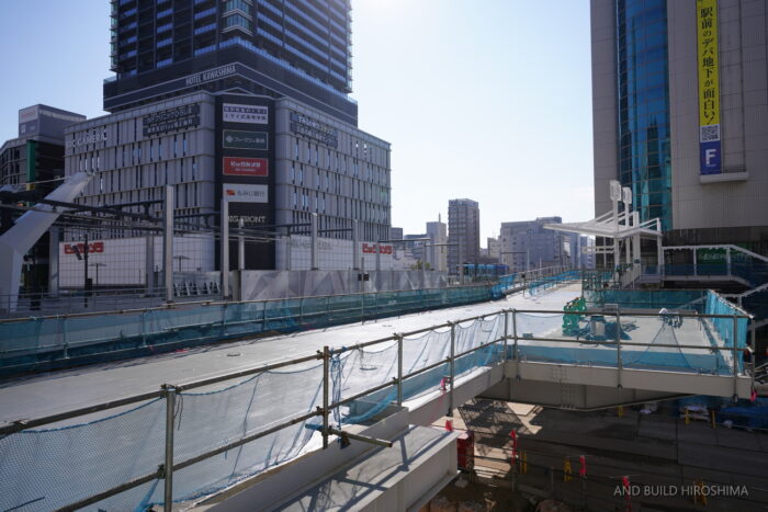 そのまま南側の猿猴川の河川緑地に至るペデストリアンデッキも同時に整備が進んでいます。