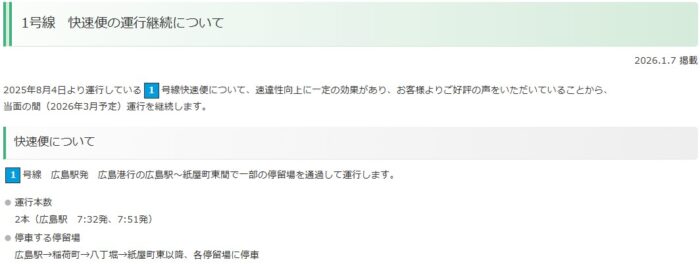 (広島電鉄『1号線 快速便の運行継続について』(https://www.hiroden.co.jp/topics/2026/0106-express.html)より)