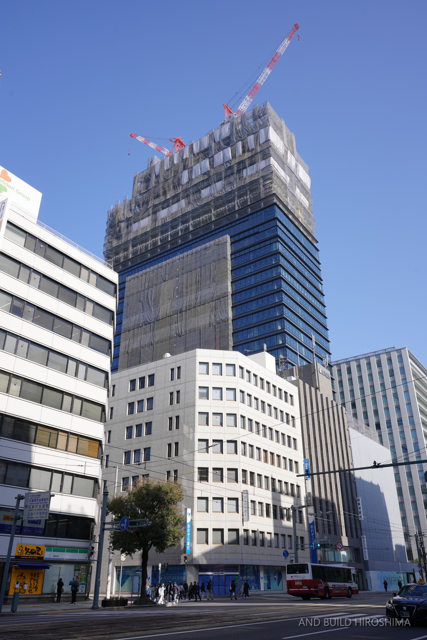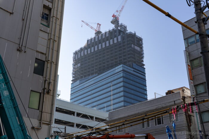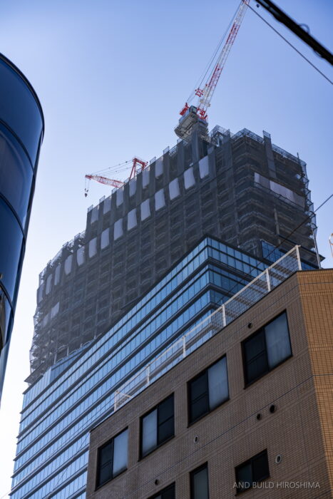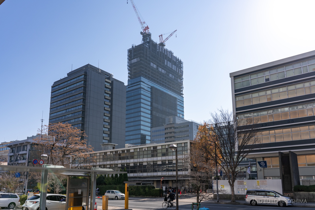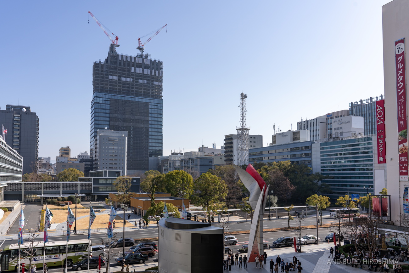 数え切れないビルの中でも主役級の存在感です。隣の「スタートラム広島」(高さ約80m)が小さく見えるのが不思議に感じます。