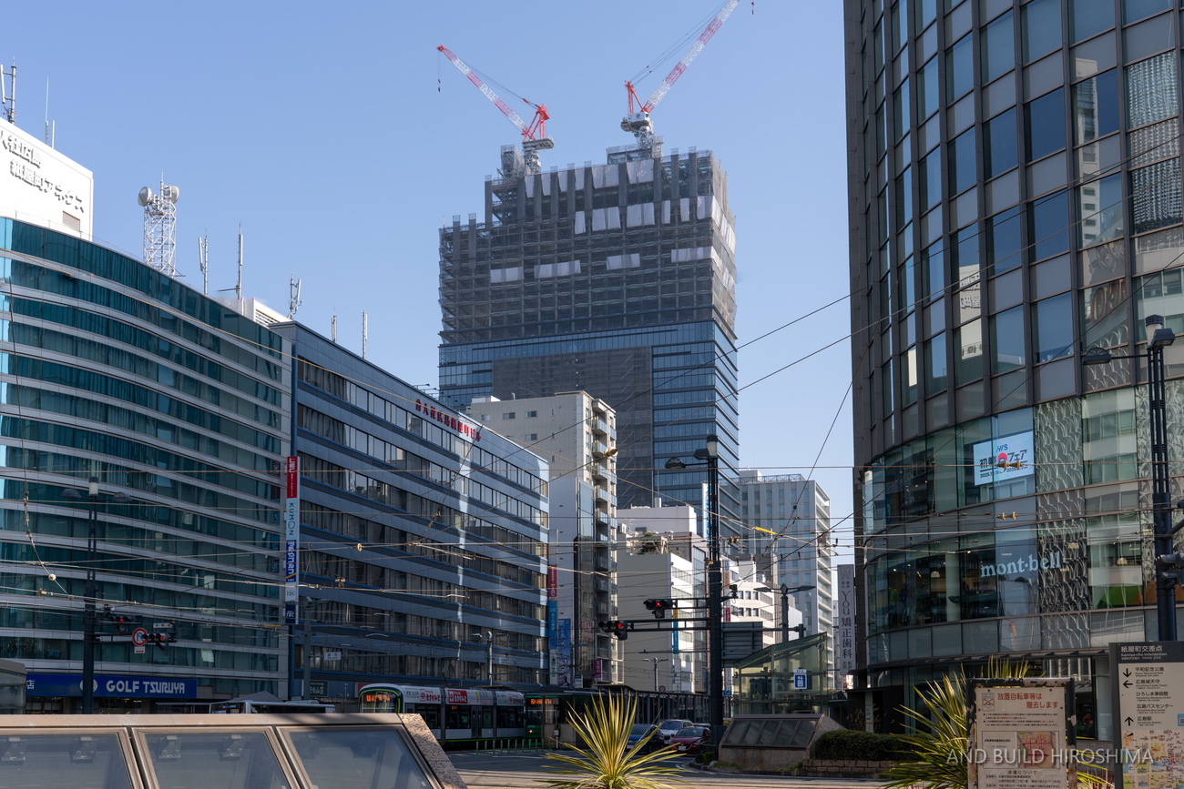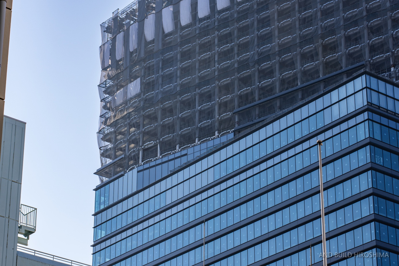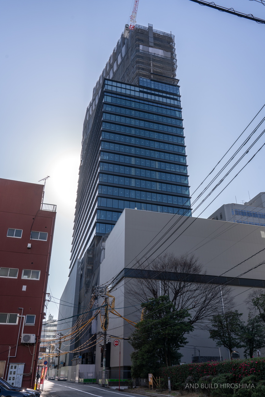 数え切れないビルの中でも主役級の存在感です。隣の「スタートラム広島」(高さ約80m)が小さく見えるのが不思議に感じます。