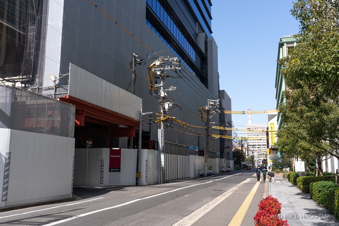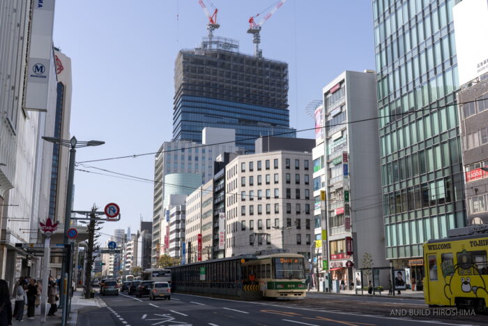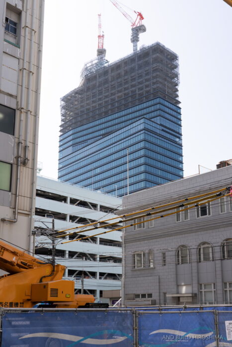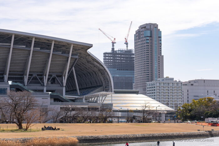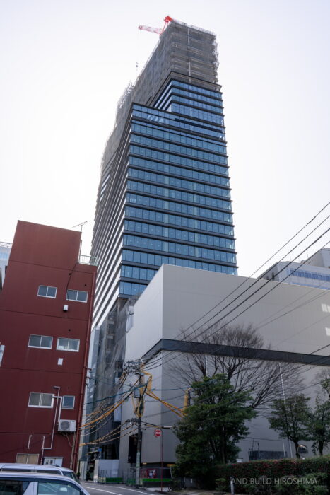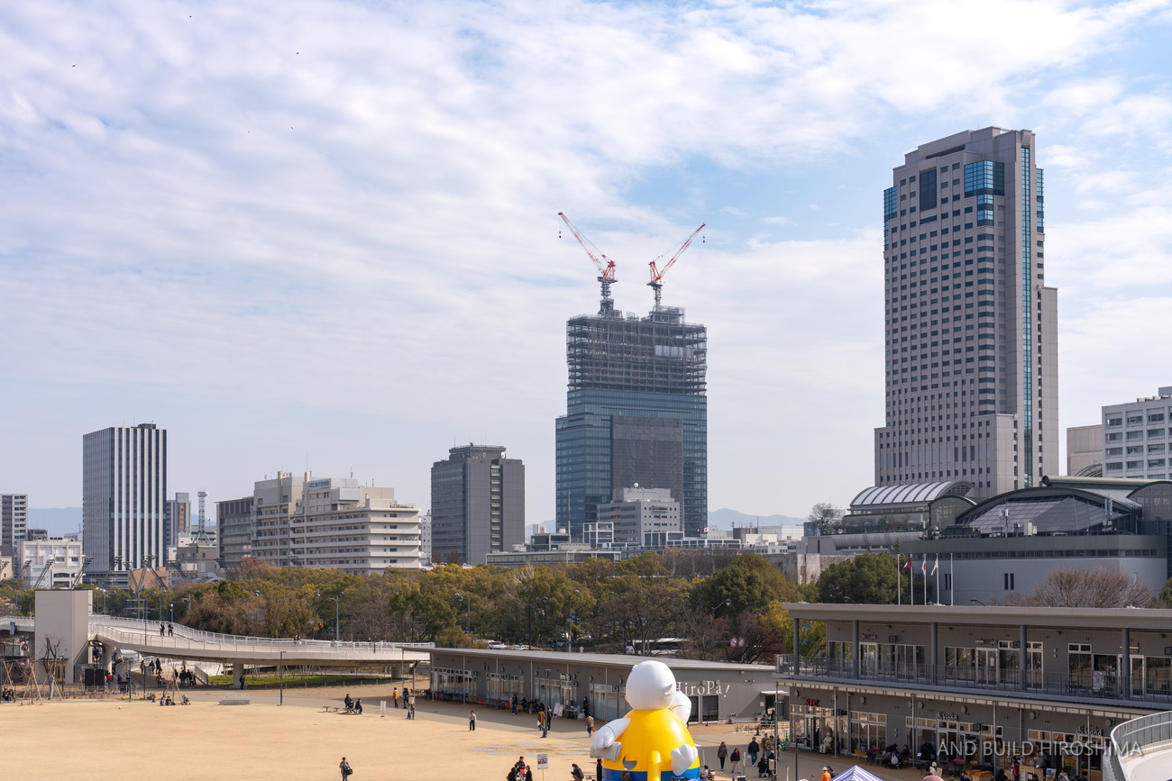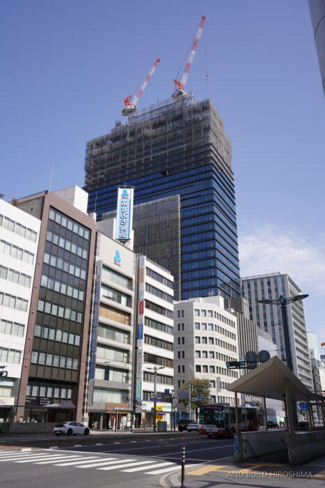 手前には鯉城通り沿いに建つひろぎんホールディングス本社ビル(地上19階 約95m、2021年竣工)が並んでいるように見えます。