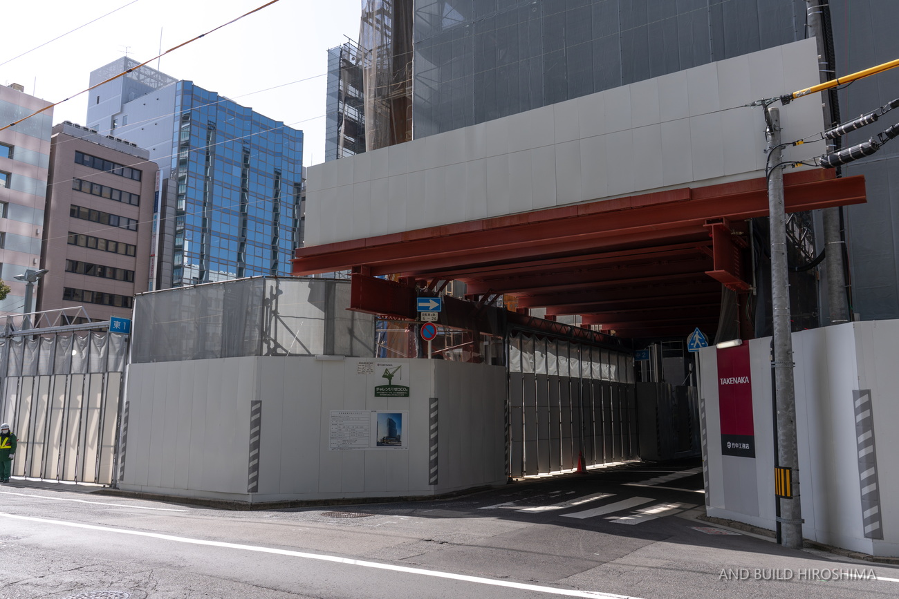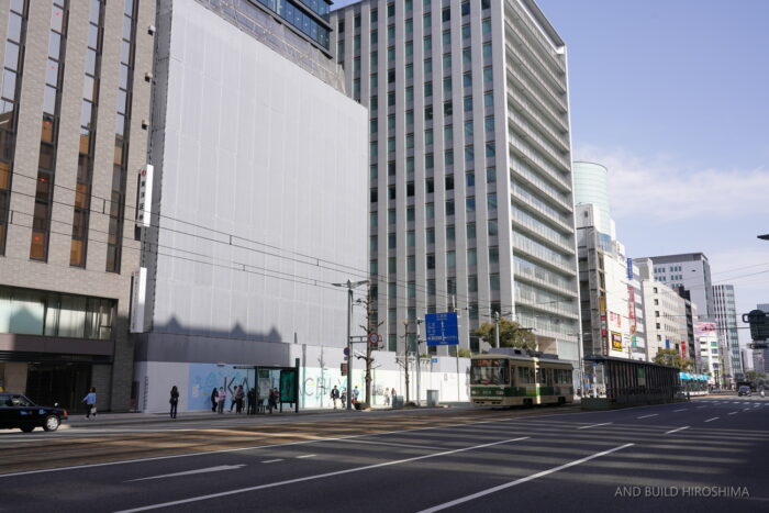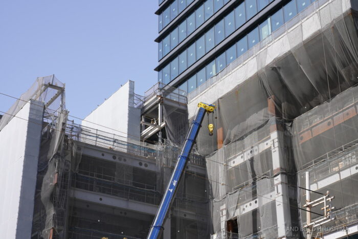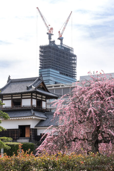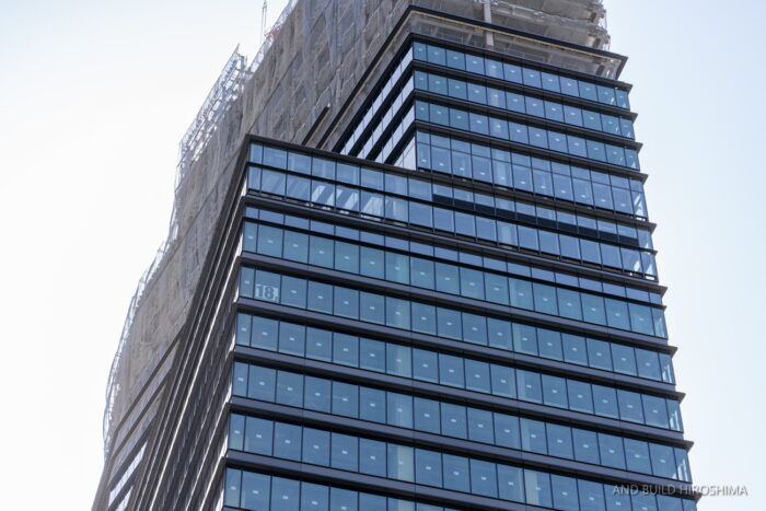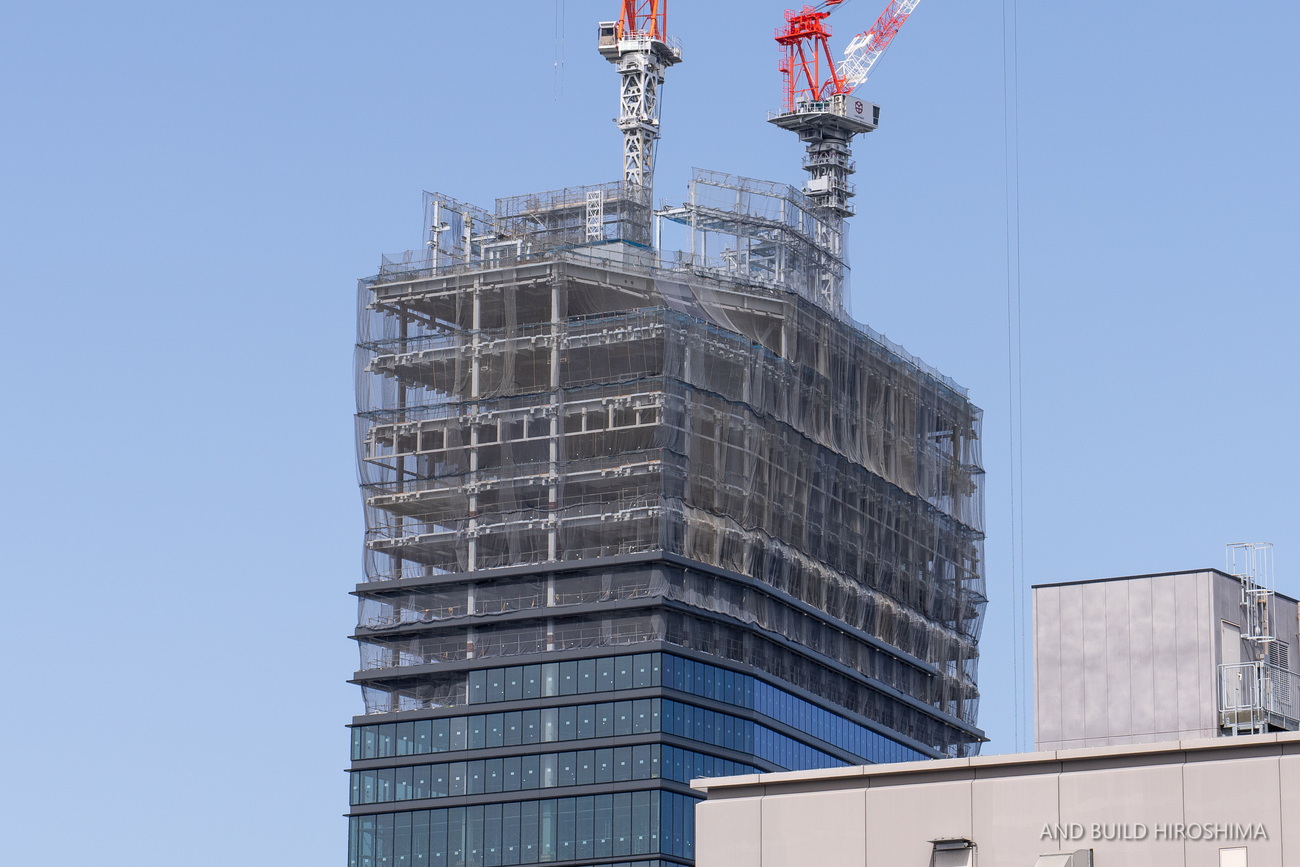 手前には鯉城通り沿いに建つひろぎんホールディングス本社ビル(地上19階 約95m、2021年竣工)が並んでいるように見えます。