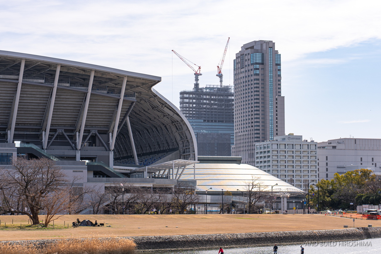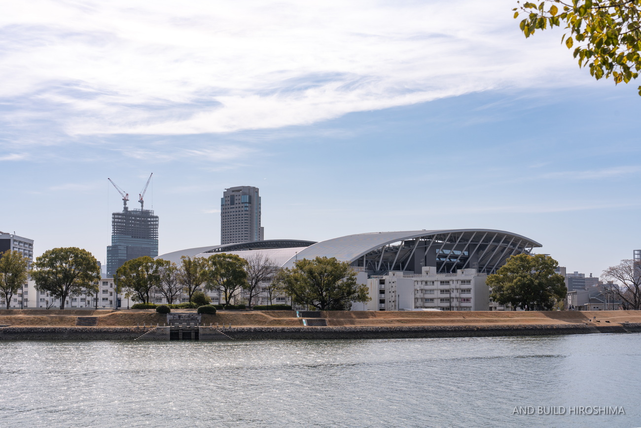 続いて、本川(旧太田川)を挟んでエディオンピースウイング広島の西側から。