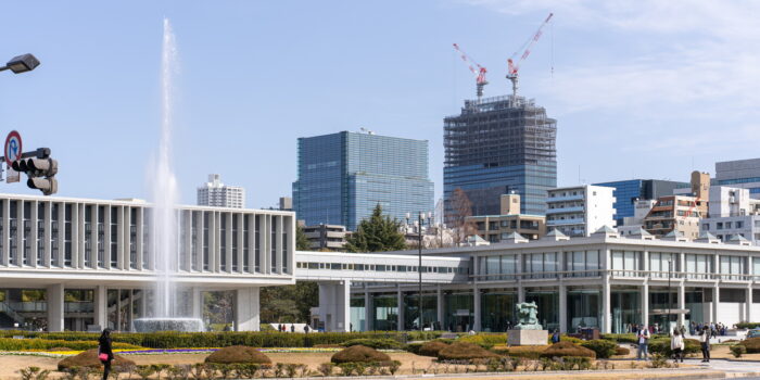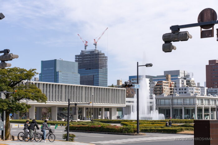 平和記念資料館の背後に、力強く復興・成長する街が非常に印象的です。