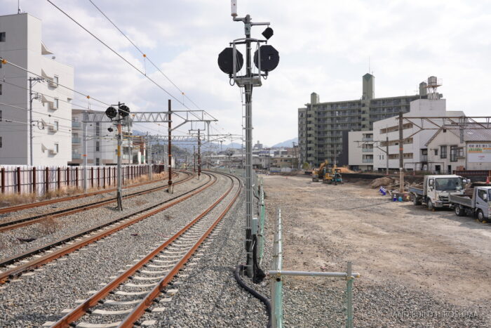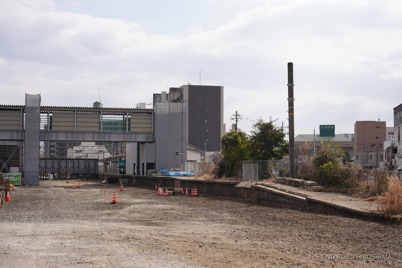 右側の従来の線路のあったスペースで、今後高架橋の基礎工事が始まっていくことになります。
