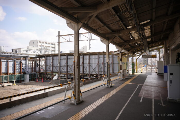 仮の足場に木板を貼ったような状態となっており、鉄骨の足場と舗装された下りホームとは対照的です。