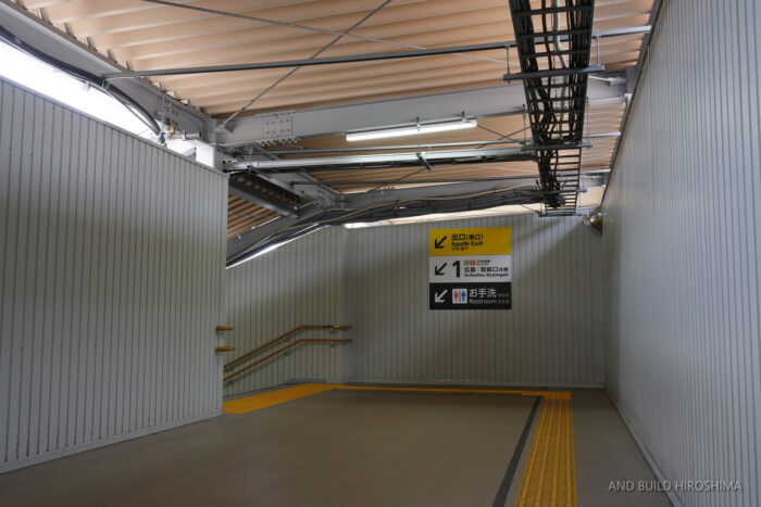 かつて線路だった空間の仮設通路から、新下りホームに渡ります。
