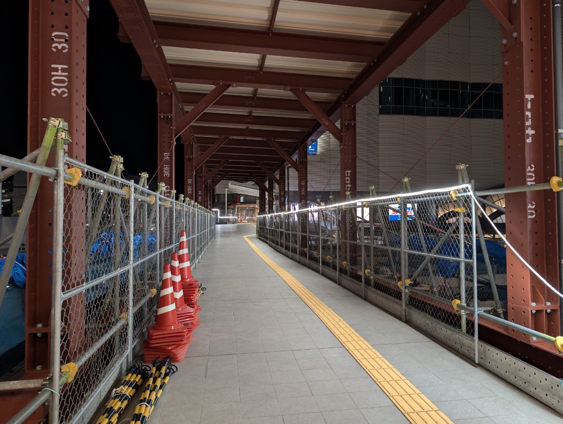 上屋が完成している城北通り横断部も、照明はどうやら本設のものにはならないようで、ロープ状のLEDがそのまま伸びていました。