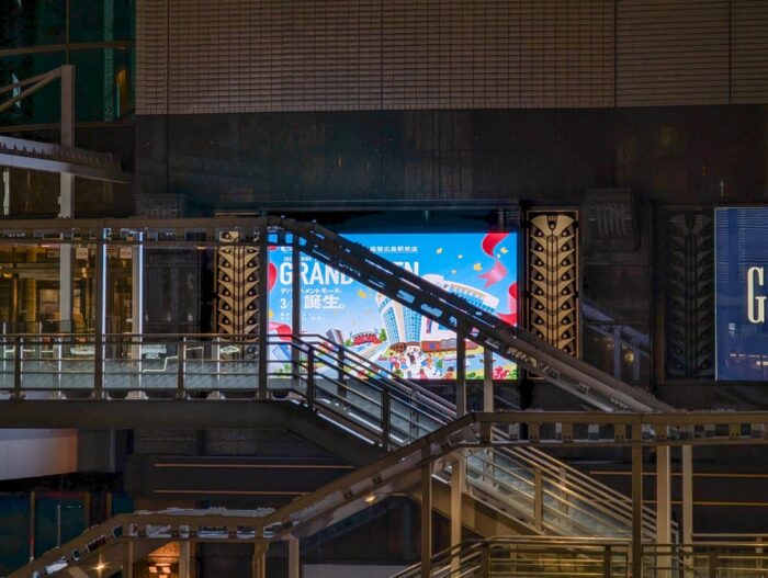 階段横のエールエールHIROSHIMAの外壁は、ショウウィンドウを転換したLEDの大型デジタルサイネージに生まれ変わりました!