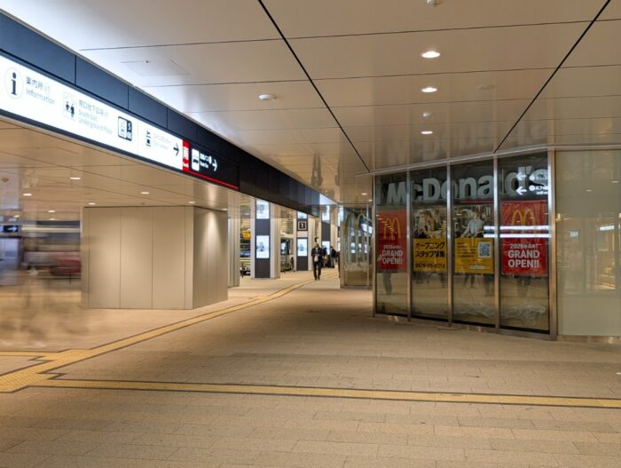 自由通路から南口の階段を1階に降りた区画では、4月に「マクドナルドJR広島駅南口店」がオープンします。