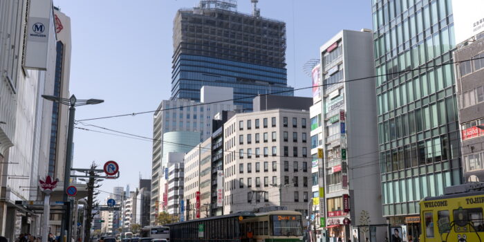オフィスやホテルなどで構成される基町相生通地区第一種市街地再開発事業の高層棟「カミハチクロス(KAMIHACHI X)」について、