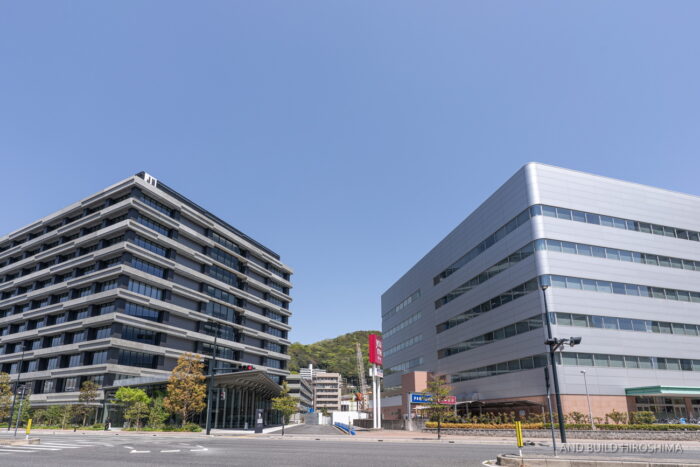 右手にイズミ本社ビル、左手には大和ハウス工業が今年1月に完成させたオフィスビル「d_ll HIROSHIMA(ディール広島)」が隣接します。